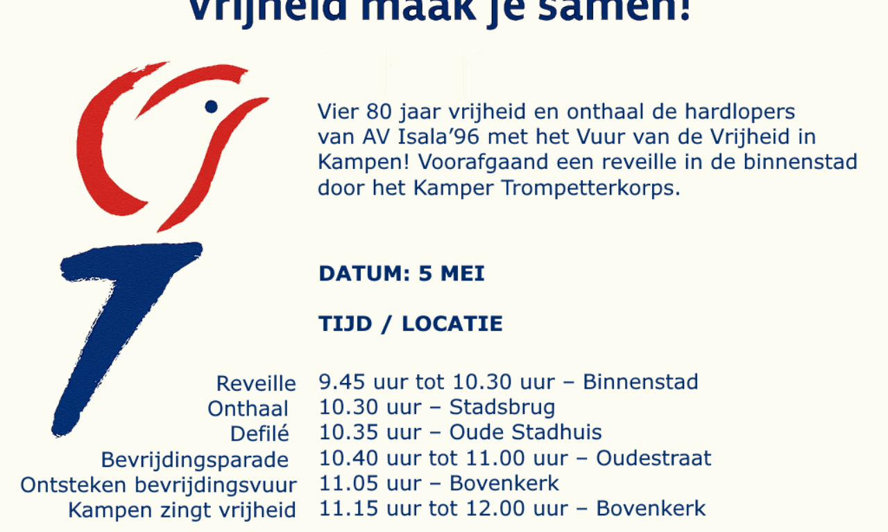 Voor het oude stadshuis wordt een defilé afgenomen, geflankeerd door het met bevrijdingsvlaggetjes zwaaiende publiek, eendrachtig de wijze waarop dat in 1945 ging. In de Bovenkerk wordt met het Vuur van de Vrijheid de Kamper vuurschaal ontstoken waarna u aansluitend kunt genieten en mee kunt zingen met Kampen zingt 80 jaar vrijheid.